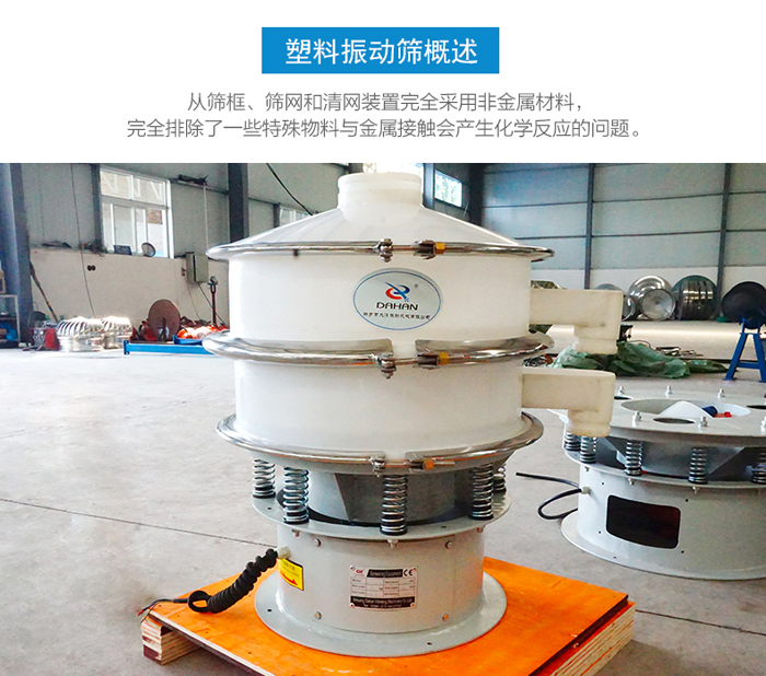 塑料振動篩也叫聚丙烯振動篩,塑料振動篩主要是為了解決篩分物料與金屬接觸而產生化學反應的問題。聚丙烯振動篩:從篩框、篩網和清網裝置完全采用非金屬材料,完全排除了一些特殊物料與金屬接觸會產生化學反應的問題。